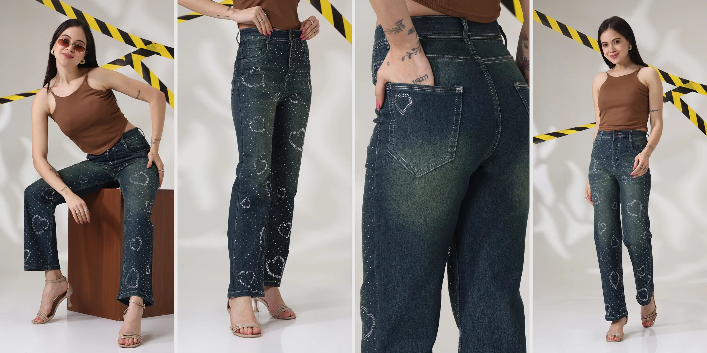 Dilbar High-Waist Wide Leg Jeans with Rhinestone Hearts